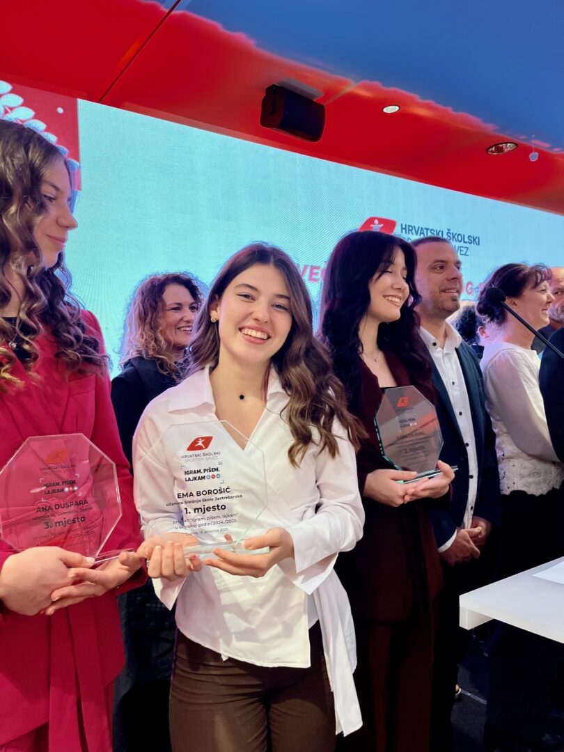 Naša učenica Ema Borošić proglašena je za najbolju novinarku Hrvatskog školskog sportskog saveza (HŠŠS)! Na svečanoj dodjeli nagrada 15. prosinca 2025. u hotelu International u Zagrebu, Ema je primila prestižnu nagradu u pratnji svog mentora, profesora Saše Rodića.