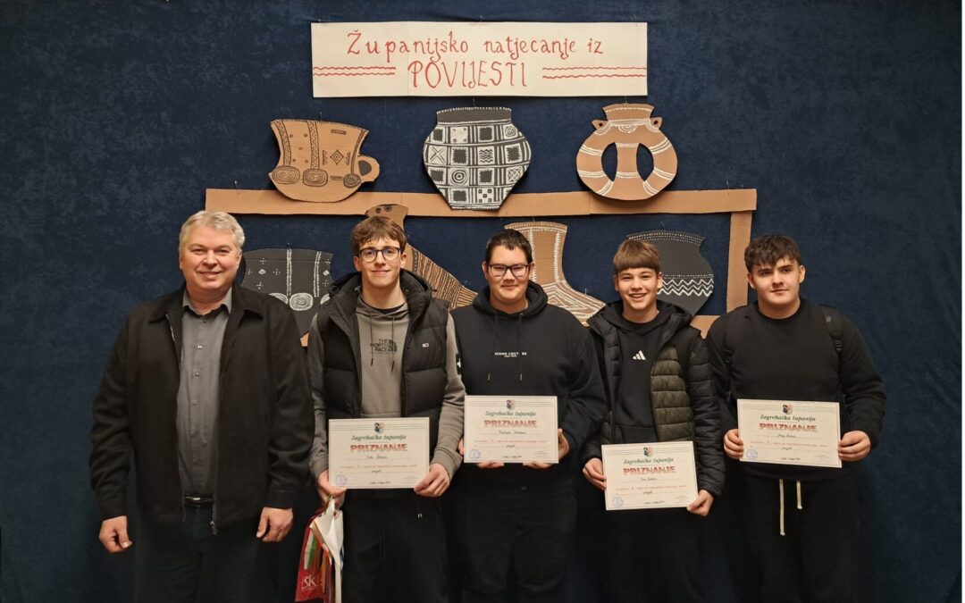 Roko Šebečić iz 4.G1 osvojio je prvo mjesto na županijskoj razini Natjecanja iz povijesti! Fran Valečić iz 1.G2 osvojio je drugo mjesto, a treći su bili Krešimir Tomašević iz 4.g1 i Josip Sračić iz 1.G2. Filip Španić iz 1.G1 bio je sedmi, Marija Hačko iz 3.G2 bila je osma, Gita Maria Rak iz 3.G2 deveta, a Ana Krljan iz 3.g1 dvanaesta. Mentor učenicima je nastavnik Goran Vreš.